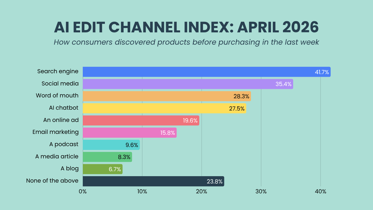Search engines are still the single biggest channel driving purchases. 41.7% of the people we asked had bought something in the past week that they had found through Google or Bing. More than social media. More than word of mouth. More than AI chatbots. More than any other channel on the list.